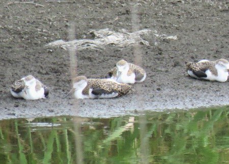 池際でお休み中のセイタカシギのヒナたち。