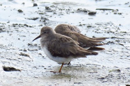 …するとそこに!イソシギらしい2羽のシギが干潟に飛来。