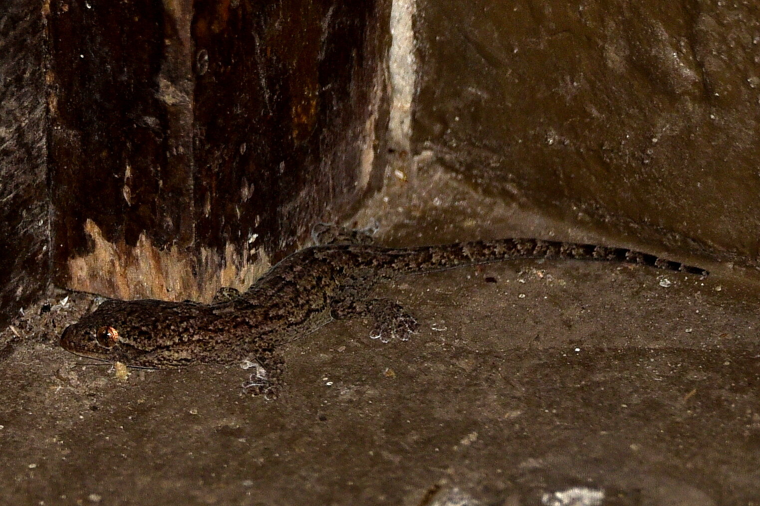 小屋の隅に、ヤモリがいました。じっと動きを止めて地面に擬態していました。