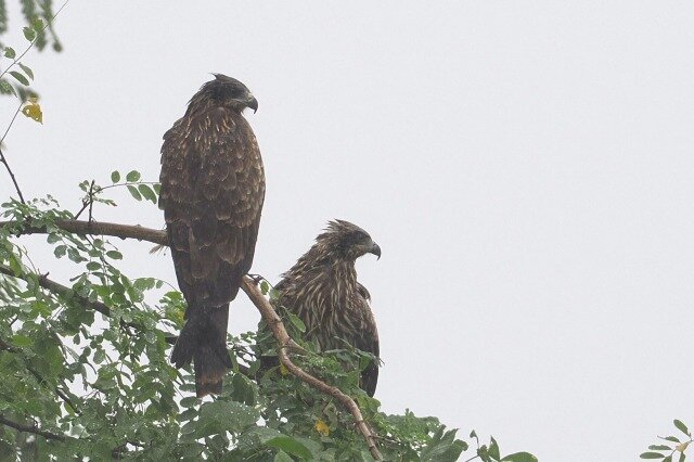 1羽が上空を旋回したのち、広場近くの木にとまっていたもう1羽のもとへ降り立ちました。