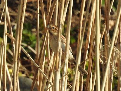 オオジュリンが10羽ほどの群れで、ヨシ原で採食をしていました。自然生態園では、夏羽に変わり始めて頭が黒っぽいオオジュリンも確認されたそうです。