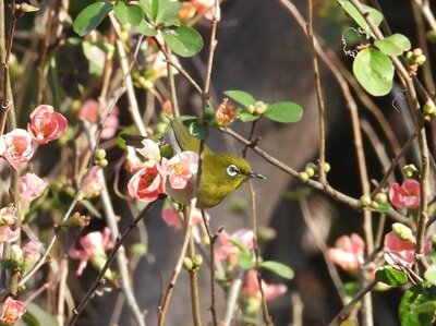 自然学習センター前のクサボケの花に、メジロが集まっていました。
