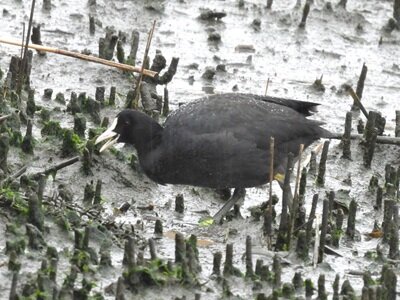 2号観察小屋からは、雨の中採食するオオバンやタシギが見られました。