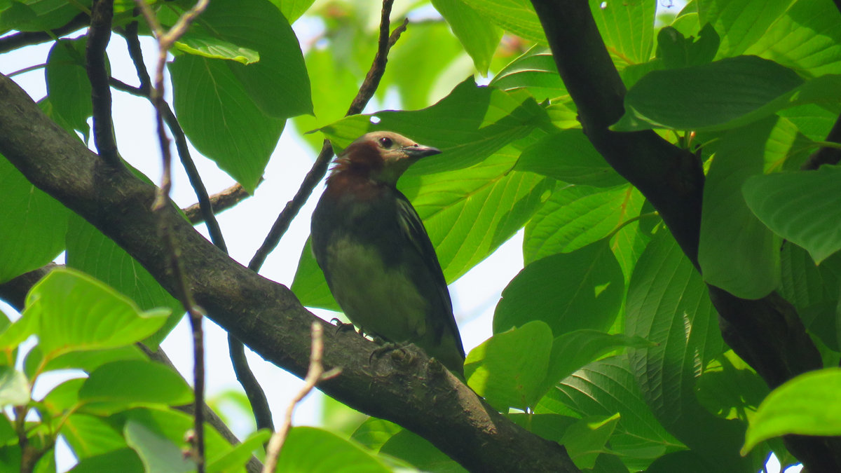 学習センターの正面、ミズキの木にコムクドリが数羽現れました。まだまだ青い実が多いですが、日当たりのよい上の方は、実が色づいているからか、よくとまっていて観察しやすいですね。