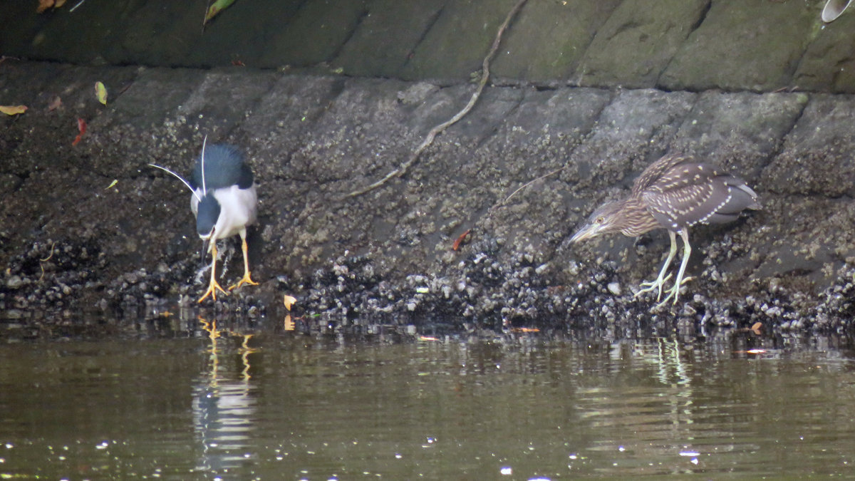 【左:ゴイサギ、右:ホシゴイ(ゴイサギの幼鳥)】