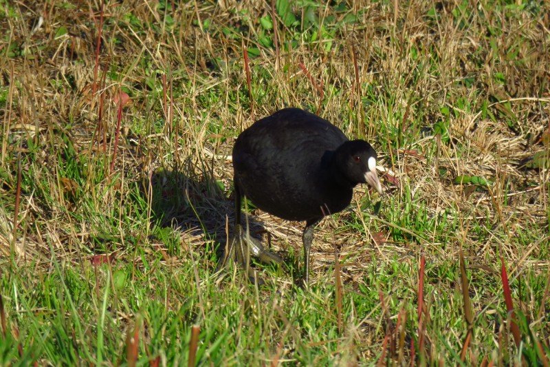 東観察広場前の草地では、オオバンたちが上陸して、せっせせっせと草をついばんでいました。