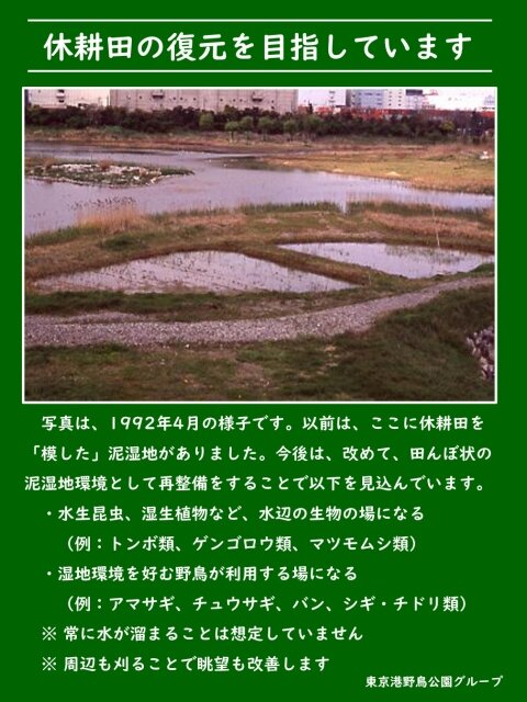 ネイチャーセンター横の芝生地と東淡水池の間には、休耕田を「模した」泥湿地がありました。