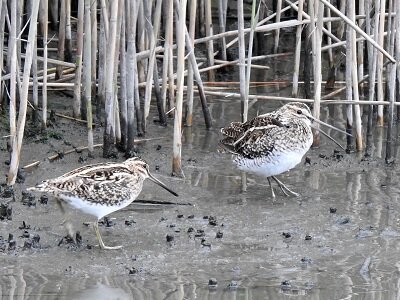 2号観察小屋からは、タシギが最大で4羽確認できました。そのほか、東観察広場前や、潮入りの池の島でも確認しています。