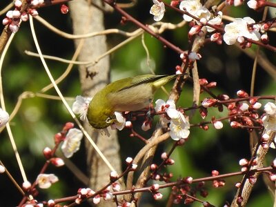 芝生広場の周りにあるウメの花には、メジロが集まっていました。