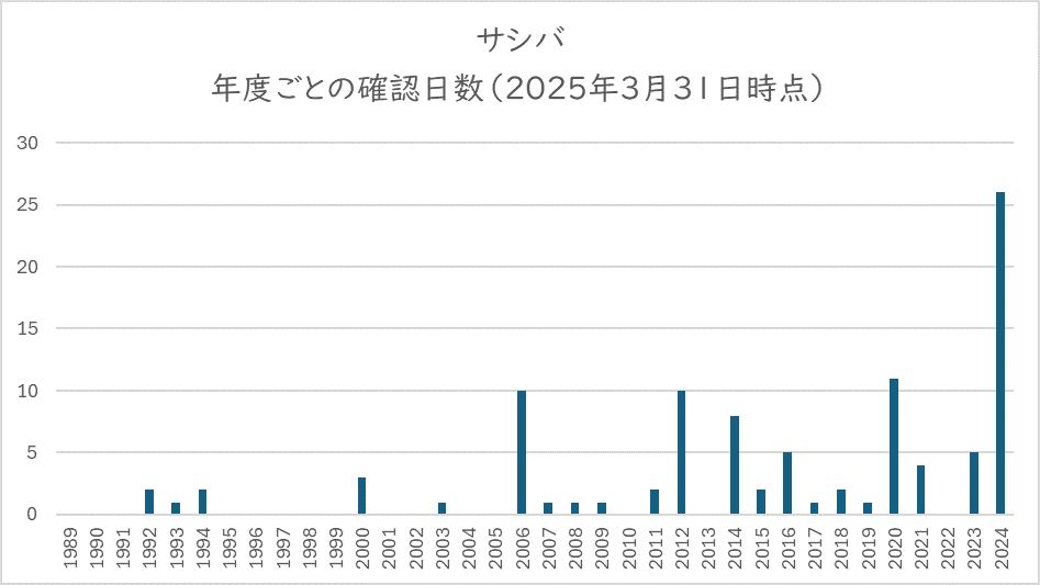 野鳥公園でのサシバの確認日数は年度ごとの変動が大きいのですが、2024年度はサシバの確認日数が最も多くなりました。